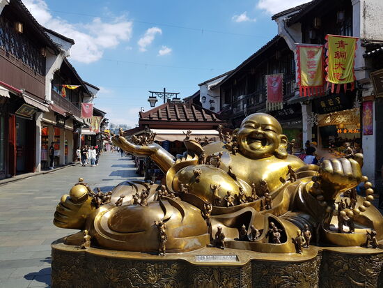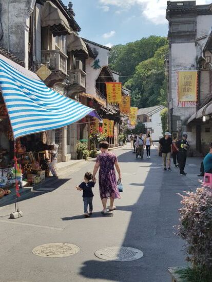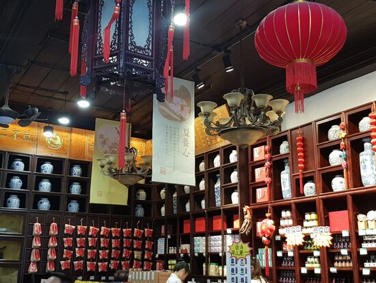 Im Anschluss sind wir wieder am Westsee entlang geschlendert und Richtung Hefang Straße ("Altstadt" Hangzhous) spaziert. Diese Fußgängerzone ist ein weiteres Highlight Hangzhous. Die Straße wirkt sehr gemütlich. Die Häuser selbst sind höchstens zweistöckig und traditionell geschmückt. Man kann Süßigkeiten, verschiedene andere Speisen, Tee, Souvenirs, Handwerkskunst und allerlei Krimskrams erwerben. In dieser Straße befindet sich auch eine historische Apotheke, deren Besuch definitiv lohnt. Man kann dort noch "richtige" (ursprüngliche) Medizin erwerben und einen Blick auf die Apotheker werfen, die so manches Heilmittel selbst zusammenmischen. Wir sind die Straße fast bis zum Ende gelaufen und dann durch die Straßen nördlich der Hefang Street spaziert, die auch sehr schön angelegt sind.