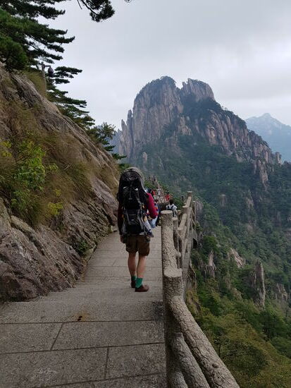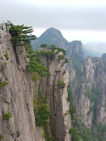 Diese ging leider nicht so schnell voran, sodass wir ungelogen von ca. 9 Uhr bis 12 Uhr anstanden. Jetzt werden sich wahrscheinlich viele fragen, wie das mit einem knapp zweijährigen Kind funktioniert. Auch wir waren teilweise ganz schön verzweifelt. Nach einer Stunde Wartezeit waren wir kurz davor, aus der Schlange zu gehen und abzubrechen. Wir haben dann überlegt, dass wir doch eigentlich nur für diesen Berg überhaupt das Reiseziel eingeplant hatten und uns den ganzen Aufwand dafür vor Augen gehalten. Unsere Tochter war zudem, zum Glück!!!, richtig gut drauf, sodass unsere Kämpfernatur siegte und wir aushielten. Neben der ganzen Wartezeit beunruhigte uns noch die Strecke der Wanderung an sich. Dem aufgemalten Plan des Hotelinhabers zufolge würde es für eine Runde zur Yuping Bergstation unter Beachtung der letzten Seilbahnfahrt nach unten recht knapp werden. Dieser Besorgnis hatte ein netter Chinese, der vor uns in der Warteschlage stand und hervorragend Englisch sprach nur entgegenzusetzen, dass wir ja auch problemlos in einem der Hotels auf dem Berg übernachten könnten. Da jedoch am nächsten Morgen unser Zug nach Shanghai von Huangshan (Stadt) aus fuhr, war dies definitiv keine Option für uns. Kurz nach 12 Uhr ging es dann mit der Seilbahn nach oben. Es war sehr windig und wolkig, also keine optimalen Voraussetzungen. Oben angekommen, hielten wir uns gar nicht groß mit ausschweifenden Fotostopps auf, sondern wollten lieber gleich los wandern. So nahmen wir die wie vom Hotelinhaber vorgeschlagene Route über folgende Etappen: Beginning-of-Believe Peak, Beihai Hotel, Bright Top, Tianhai Hotel, Turtle Peak, Lotus Peak, Greeting-guest pine und dann zur Yuping Bergstation (letzte Talfahrt laut Hotelinhaber ca. 16.30 Uhr). Wir haben für die Wanderung ca. 3 Stunden bei wahnsinnig viel Personenverkehr auf dem Berg benötigt. An den Fotospots bleiben die Menschen in Scharen stehen, nicht zu vergessen die ganzen Reisegruppen und es bilden sich häufig Staus.