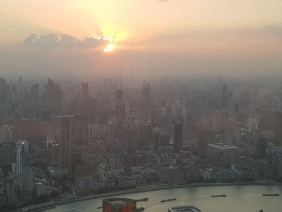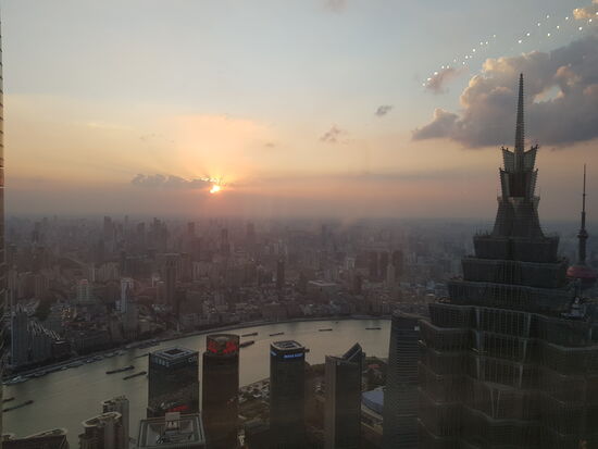 Anschließend sind wir nach Pudong gefahren. Ziel war hier direkt das Shanghai World Financial Center mit der Bar des Park Hyatt Hotels in der 85. Etage. Wir hatten uns vorgenommen, von dort aus den Sonnenuntergang über dem Teil jenseits des Flusses anzusehen. Tatsächlich ging es auch ganz einfach. Wir sind mit der Fähre über den Fluss gefahren und von dort zum SWFC gelaufen. Es ging ohne Warteschlange direkt in den Aufzug hoch ins Restaurant und an der Fensterfront bekamen wir einen Platz. Wir haben uns einen Negroni bestellt und einfach den Moment genossen - so wie es mit unserer Tochter möglich war.