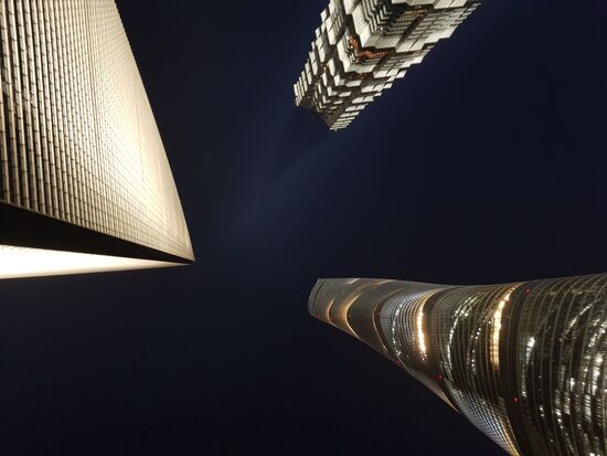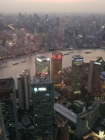 Danach sind wir über die Nanjing Dong Lu wieder zum Bund gegangen, da wir im Reiseführer gelesen hatten, dass auf dem Fluss auch Bootsfahrten angeboten werden. Wir sind die Uferpromenade auf und ab gelaufen und haben vergeblich einen aussagekräftigen Hinweis darauf gesucht. Irgendwann haben wir auf einem Schild den Terminal dafür identifiziert. Aber wo soll der Zugang sein? Aaaah, nach erneutem Hin und Her, fanden wir ihn von der Straße aus, die hinter der Promenade entlangführte. Dort sagte man uns schließlich, dass wir die Tickets oben auf der Promenade an einem Stand kaufen müssten. Na gut, wieder zurück und tatsächlich nach ganz genauem Hinsehen fanden wir ein unscheinbares Fahrrad mit einem kombinierten Verkaufsstand, wo wir unsere Tickets kaufen konnten. Eigentlich wollten wir direkt am Nachmittag die Bootsfahrt machen. Die nächste würden wir nicht mehr schaffen, dann die übernächste. Aber uns wurde vorgeschlagen, die Fahrt doch vielleicht im Dunkeln zu machen, wenn alle Gebäude am Bund und in Pudong beleuchtet sind. So haben wir es dann auch gemacht. Also hatten wir kurzerhand wieder Zeit verfügbar. Eigentlich fanden wir es als überflüssig, aber so haben wir uns spontan entschieden, doch die Aussichtsplattform des Shanghai Towers zu besuchen. Also ging es wieder mit der Fähre hinüber auf die andere Seite nach Pudong und in ein paar Minuten weiter zu Fuß direkt dorthin. Es gab keine Warteschlange, sodass wir direkt nach dem Ticketkauf mit dem schnellsten Aufzug der Welt in 20,5 m pro Sekunde im Handumdrehen nach oben rasten. Die Sicht war, obwohl ein bisschen dunstig, atemberaubend. Andere Hochhäuser erschienen von dort oben als Miniatur und wir konnten von Pudong den Huangpu weit auf und ab sehen.