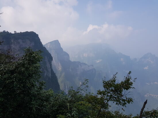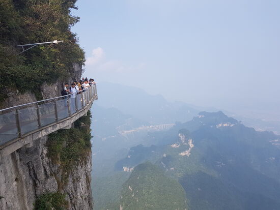 Wir entschieden uns für einen Wanderweg, der einmal rund um das Plateau führte. Neben uns machten dies auch viele weitere Touristen und zahlreiche chinesische Reisegruppen, die von einem Reiseleiter mit Megafon und musikalischer Untermalung geführt wurden. Man kann den Rundweg auch an einigen Stellen abkürzen. Der Rundweg selbst ist sehr kurzweilig, was bei uns auch durch wunderbares Wetter (Sonne-Wolken-Mix) begünstigt wurde. Man hat an einigen Stellen die Möglichkeit, anstelle des normalen betonierten Weges den Glasbodenweg zu wählen, der sich dann über einige Meter entlang des Plateaus windet. Dies kann man mal gemacht haben, aber einer dieser Wege reicht nach unserer Erfahrung aus. Als wir uns zuvor Bilder des Glasbodenweges angesehen haben, sah dieser um einiges spektakulärer aus, als er uns dann tatsächlich erschien. Aber dennoch beeindruckend, vor allem die Bauweise des Ganzen!