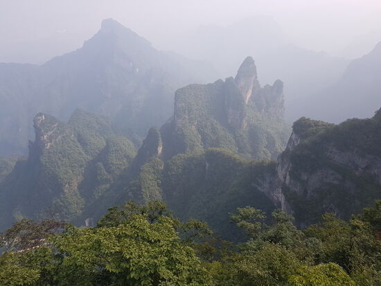 Man fährt also eine gute halbe Stunde damit nach oben und kann schon da beeindruckende Felsformationen bewundern. Oben angekommen, hatten wir wieder einen dieser Überraschungsmomente. Man bedenke, dass ich mir vor der Chinareise noch gute Trekkingschuhe zugelegt habe, da unser Gepäck für richtige Wanderschuhe leider keinen Platz bot. Wir hatten fest geplant, in China wandern zu gehen und verschiedene Berge zu erklimmen. Aber das Bild, was sich uns an der Bergstation bot, war ein anderes. Nicht nur die Bergstation, sondern auch alle Wanderwege auf dem Bergplateau waren bestens betoniert, sodass man alles problemlos mit einem Buggy hätte abfahren können. Anstatt Wanderschuhe wären auch Flip Flops oder Absatzschuhe gegangen, was viele Chinesen bewiesen haben. Einerseits gut, so konnte unsere Tochter auch ganz unbeschwert laufen, aber andererseits auch etwas erschütternd, wie man so in die Natur eingreifen kann.