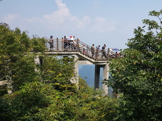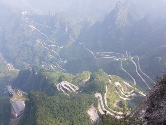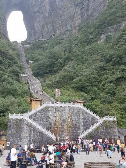 Hervorragende Ausblicke hat man aber sonst auch von vielen anderen Stellen auf dem Plateau, da sich der Weg meistens am Abgrund entlang schlängelt. Bei uns entstand manchmal auf dem Weg etwas Stau, wir waren freitags da, aber es war noch erträglich. Kurz warten und weiter ging’s. Nach dem Ende des Rundgangs sind wir mit einer elendlangen Rolltreppe!!! durch den Berg zur „Heaven’s Gate Cave“ gefahren. Dies ist ein riesiges Loch im Fels. Von dort ging es dann die schon erwähnten 999 Stufen nach unten, wo es mit dem Bus wieder zur Talstation der Seilbahn ging. Die Treppe ist sehr steil. Man muss wirklich aufpassen, dass man auch die einzelnen Stufen trifft.