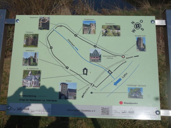 Ein Rundweg wird vorgeschlagen, um eine weitgehend erhaltene mittelalterliche Stadtmauer, die sich imposant an die Lahn anschmiegt anzusehen. Zwei der ursprünglich sieben Wehrtürme sind heute noch erhalten, einer davon ist als der „Schiefe Turm von Dausenau" weit über die Grenzen bekannt.