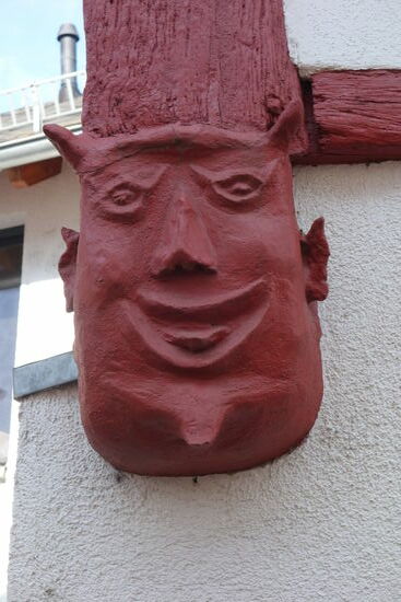 Eine Metalltafel an einem Holzständer, der den weit vorragenden ersten Stock des Hauses trägt, zeigt zwei Schmiede bei der Arbeit. Ein solcher Vorbau vor der Schmiede war besonders praktisch für das Beschlagen der