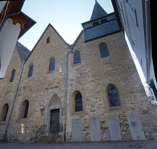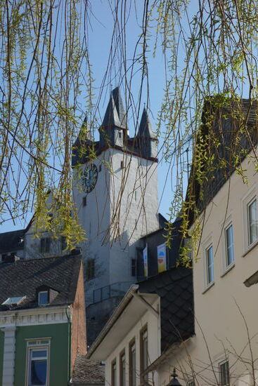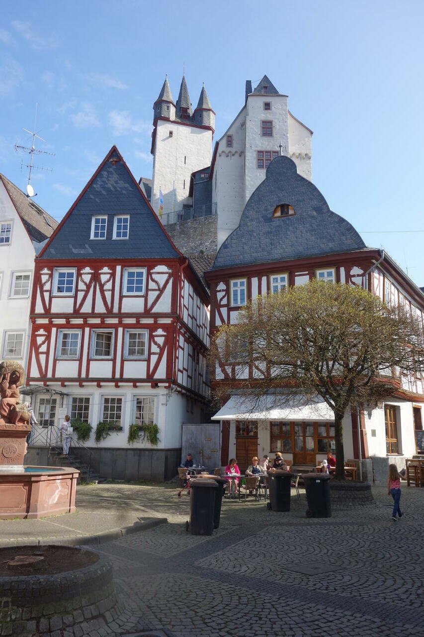 Von hier kann man St. Peter sehen, die evangelische Pfarrkirche, die sich über dem rechten Lahnufer erhebt. Der rote neugotische Bauschmuck ziert den gelb verputzten Bau, dessen Anfänge in das 13. Jahrhundert zurückreichen. 1269 wird