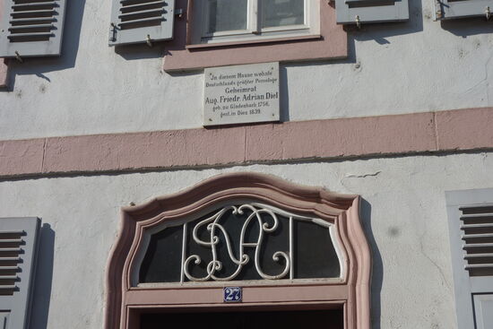 In die Reihe der herrschaftlichen Häuser am Fuße des Schloßbergs gehört auch das Haus Eberhard am oberen Ende der Pfaffengasse. Als kleines Stadtpalais im Stil des Rokokos entstand es um 1784. In ihm wohnte Geheimrat August Friedrich Adrian