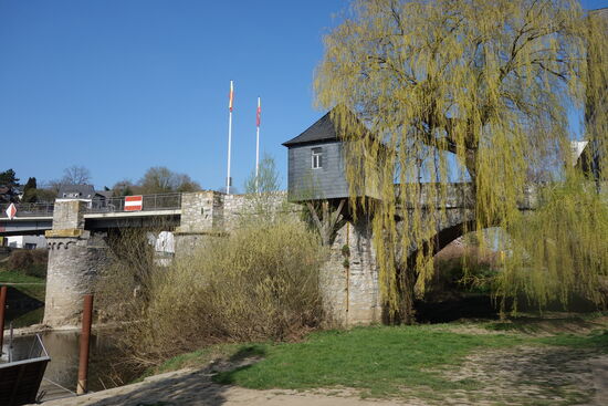 Einen schönen Blick auf die historische Brücke und das daran „hängende“ Häuschen erhält man von einem Abstecher durch Knechts Gässchen zum Lahnufer.