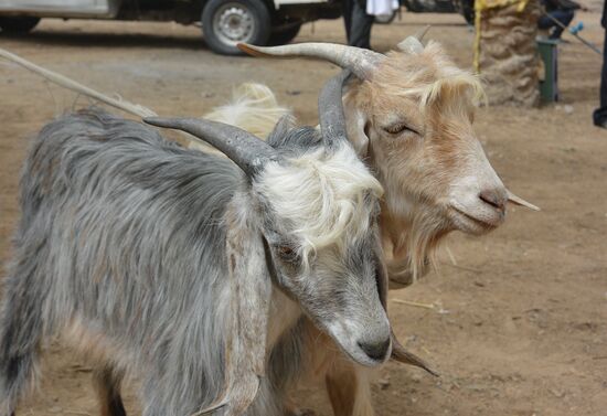 Außerhalb des Marktplatzes findet unter Palmen ein Viehmarkt statt. Hier stehen Gruppen von Schafen und Ziegen, die von den Käufern betastet, hochgehoben und geprüft werden, bevor sie nach abgeschlossenem Handel an den Ohren oder an einem der Hinterfüße zum Pickup gezerrt werden. Lämmer werden von ihren Müttern getrennt. Sie stehen noch lange rufend zwischen anderen eng zusammengepferchten Tieren auf den Ladeflächen der Fahrzeuge. Viele Schicksale werden hier besiegelt. Wer weiß, wie viele der Tiere hier den Abend dieses Tages nicht mehr erleben werden.
