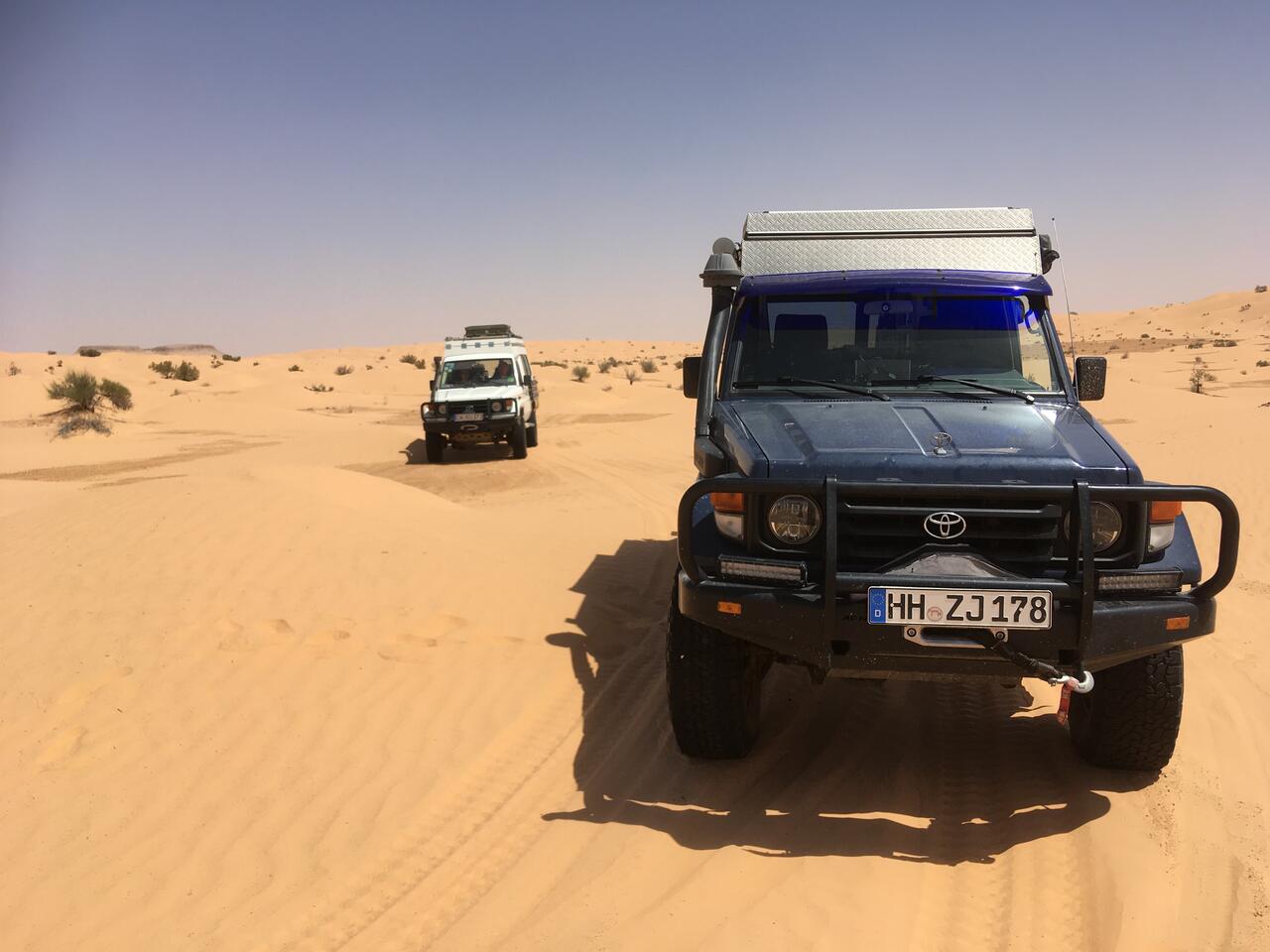 Also stopp, wieder zurück, wieder soweit wie möglich rückwärts die hinter mir liegende Düne hinauf, um dann, mit laut aufheulendem Motor im zweiten Gang erneut auf den Sandberg zu zuschießen. Der Wagen kommt in Fahrt, die große Nase mit dem Toyota-Emblem darauf hebt sich steil nach oben, ich sehe nur noch den blauen Wüstenhimmel durch die Windschutzscheibe. Ich bewege mich ins Nichts, im Vertrauen darauf, dass der Weg unter uns hinter der Düne weiter geht. Der Wagen steigt, steigt und steigt mit laut heulendem Motor, wird langsamer und immer langsamer bis er schließlich in die Kippbewegung kommt und die Konturen der Dünenlandschaft um uns herum wieder sichtbar werden. Vor uns ist wieder die Spur im Sand zu erkennen, der wir folgen. Wir sind durch. Aber jetzt bloß nicht stehenbleiben. Da ist schon die nächste Düne, vor uns, auf die wir hinaufkommen müssen. Allerdings geht es jetzt gerade hindurch, so dass wir genügend Schwung bekommen. Nach 4 weiteren Wellen kommen wir bei den beiden anderen oben wartenden Fahrzeugen an. Das war nicht mehr lustig. Wir beratschlagen, ob wir diesem Weg weiter folgen sollen, der aus insgesamt 20 solchen Dünenquerungen besteht. Die zweite von diesen haben wir jetzt noch nicht einmal geschafft. Vor Sonnenuntergang werden wir bei diesem Vorankommen bestimmt nicht den Verlorenen See erreichen.