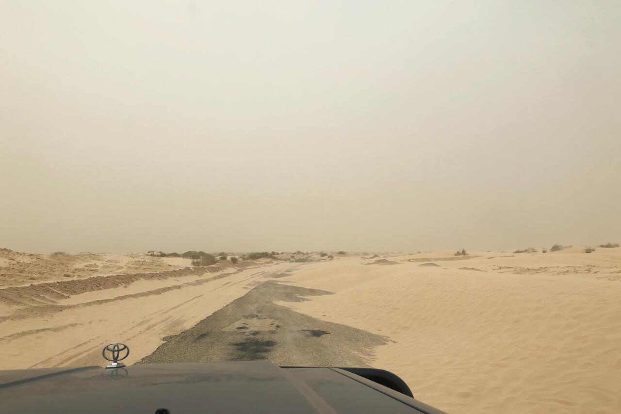 Draußen heult heute morgen der bereits angekündigte Sturm. Der Sand wird in Schwaden dicht über dem Boden über die Ebene getrieben. Der Himmel ist dunstig - kein Blau bis zum Zenith. Die Sonne ist jetzt nur noch ein milchig heller Fleck über uns. Das Fahrzeug wackelt im Takt der Windböen.