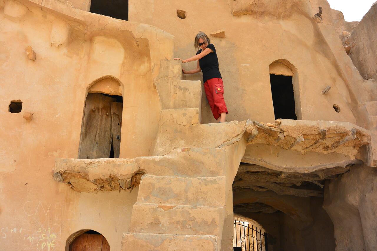 Wir fahren nach Tataouine, um uns die in diesem Gebiet noch existierenden Speicherburgen anzusehen. Eine Ansammlung von in Waben übereinander geschachtelten Lehmbauten um einen mit einem Eingangstor abgeschlossenen Platz nennt sich Ksar. Viele von ihnen sind verfallen, da der Zahn der Zeit eine permanente Restaurierung erfordert, das Geld dafür aber nicht vorhanden ist. Andere sind gut in Schuss und werden als Speicher, als Café, oder als Laden genutzt.