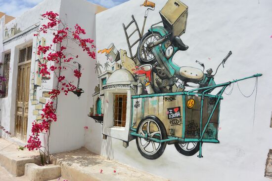 Im Süden von Houmt Souk kommen wir durch das Dorf Erriadh. Ein Teil dieses Dorfes hat sich zu “Djerba Hood“ herausgeputzt. Graffiti-Künstler aus der ganzen Welt haben Hausfassaden mit ihren Kunstwerken versehen. Hinter jeder Ecke stoßen wir auf neue Kreativität, Phantasien und Gesellschaftskritiken.
