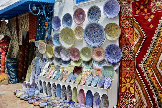Der Ort Sidi Bou Saïd, hoch oben auf den Klippen gelegen und von der Marina aus über eine lange Treppe zu erreichen, ist perfekt restauriert und touristisch ausgesprochen gut aufbereitet. Hier landen Reisebusladungen von Touristen auf einem Tagesausflug von Tunis, die sich dann, adrett gekleidet, in größeren oder kleineren Gruppen durch die Gassen schieben. Wir werden wieder häufig von den Händlern angesprochen. Sie versuchen, uns in ihre Läden zu locken, in denen es viele Andenken zu kaufen gibt.