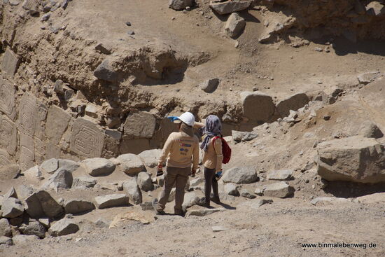 Als wir in Cerro Sechín ankommen, sind wir wieder fast auf Meereslevel. Entdeckt und ausgegraben wurde die Anlage vom peruanischen Archäologen Julio C. Tello, ohne Zweifel ein extrem fleißiger Mann, der wohl auch die nötige Fantasie besaß, an den richtigen Orten zu graben, und zwar nicht nur hier in Cerro Sechín. Seit 1937 wurde unter anderem ein 38 x 38 Meter großer Hauptbau freigelegt.