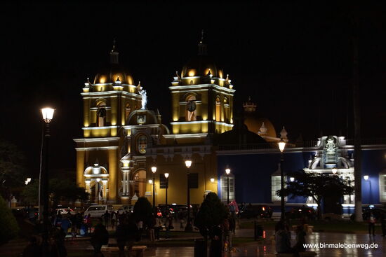 Es ist schon ein paar Stunden dunkel, als wir in Trujillo ankommen. Für einen kurzen Rundgang reicht meine Zeit noch, bevor wir uns auf ein Bierchen und einen Pisco Sour treffen. An der Plaza de Armas erwarten mich neben der Kathedrale noch etliche Häuser in Kolonialarchitektur, die meist nur aus einem Erdgeschoss bestehen. Klasse, dass unser Hotel gerade einmal 100 Meter vom zentralen Platz entfernt liegt.