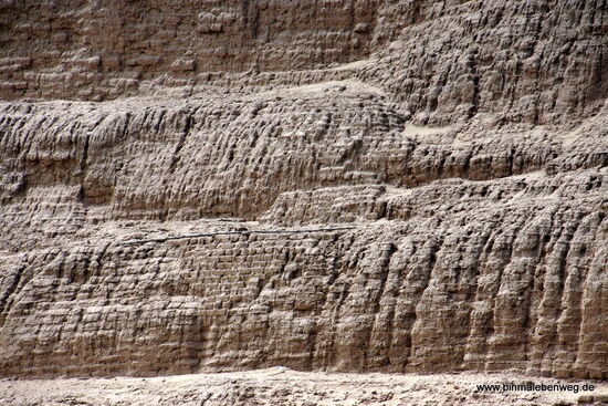 Von weitem schauen die Sonnen- und Mondpyramide aus wie Sandberge. Ohne Schutz würden sie dank El Nino auch in kürzester Zeit zu eben solchen werden, handelt es sich doch um Bauten aus ungebrannten Lehmziegeln. Als die Mochica (ca. 100 bis 800 n. Chr.) diese errichteten, war diese Gegend knochentrocken. Es regnete praktisch nie, sodass ein Leben nur dank einer intelligenten Bewässerung der Felder über den Rio Moche möglich war. Sie mussten aber auch nicht befürchten, dass die Pyramide vom Regen weggeschwemmt wird.