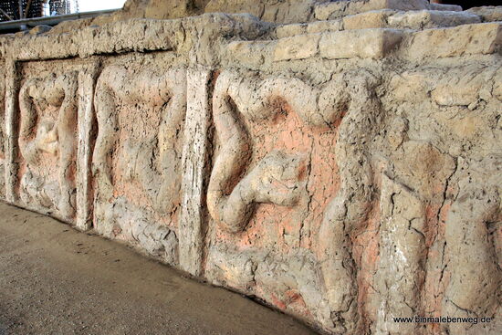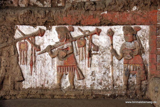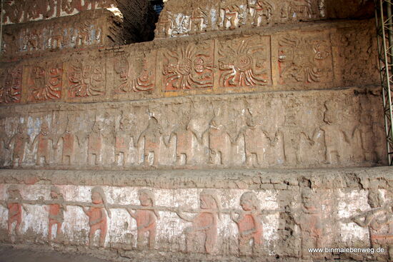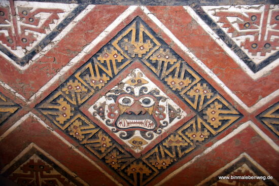 1899 entdeckte der deutsche Archäologe Max Uhle in den verschiedenen Ebenen der sechs Stufen der Mondpyramide verschiedenfarbige Malereien und Reliefs. Wenn man diese das erste Mal sieht, hält man unwillkürlich den Atem an. Auch ich, der dankenswerterweise schon weit herumgekommen ist.