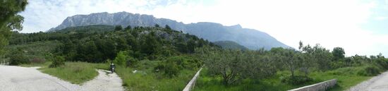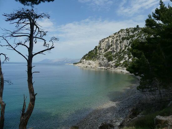 Heute ist Mopedpause. Ausschlafen war trotzdem nicht so richtig, da hier um 07:00 der Arbeitsalltag mit Hämmern begann. O.k. 07:30 aufstehen, duschen und los geht's zur Wanderung. Zuerst unten einen Kaffee trinken, dann beim Bäcker ein Frühstück besorgt und auf einer Bank am Wasser gegessen. Da die ersten Tropfen fielen und es ziemlich grau aussieht, gehe ich nochmal hoch, die vergessene Regenjacke holen. (Es blieb bei den paar Tropfen und holen der Jacke war vollkommen umsonst ). Egal ich laufe dann los und die ersten 2 km sind noch Promenade und einigermaßen belebt. Mit dem Wechsel auf Kiesuntergrund wird es leer. Ich bin fast allein unterwegs und die Sonne scheint. Ich komme ganz schön ins schwitzen, obwohl es keine Steigungen gibt. Die erste Pause mache ich auf einer Schattenbank, nachdem die Bebauung Makarska's aufgehört hat mit herrlichem Blick auf die Berge. Einen Artikel in der Zeit gelesen und weiter geht's. Es gibt die Sonnenstücke und Abschnitte schön durch die Pinien und es gibt immer wieder kleine Badebuchten --- aber nicht immer leicht zu erreichen und um diese Zeit noch leer. Mit einigen Fotostopps und weiteren Trinkpausen komme ich so gegen 11:00 am Ziel "Marina Romana " an. Das letzte Stück auf dem groben Kiesel war nicht so gut für den Arthrosefuß. Nach weiteren Fotos und Trinken wandere ich wieder zurück. Es kommen mir drei Mountainbiker entgegen, von denen 2 aber schieben (kann ich sehr gut verstehen ). Dann gibt es noch die jugendlichen Jogger (alles Mädels) und bis zur nächsten Pause an der Shishabar wars das an Menschen. Bis hierhin ging der Rückweg schneller als der Hinweg. Das Telefon muss jetzt an die Power und nach der Schattenpause geht's weiter. Dann kommt eine Bucht, die ein Mann für sich zum FKK-Strand erklärt hat. Man muss ja nicht hingucken. Einige Zeit später betrete ich dann wieder die Promenade und es wird mit jedem Meter voller und in Makarska ist es belebt und inzwischen haben auch die Buden auf, d.h. Souvenirs, Essen, Fahrradverleih usw. Ich gehe noch am Hafen vorbei und dann wieder bergauf zu meiner Unterkunft. Duschen ist angesagt und kurze Verschnaufpause. Dann geht es wieder runter, um entspannt den Nachmittag am Strand zu verbringen. Auf dem Weg hole ich mir beim Konzum noch ein pasr Weintrauben, die ich am Hafen auf einet Bank verspeise. Dann zum Strand und mal auf einer Sonnen- , mal auf einer Schattenbank lesen oder Leute beobachten. Plötzlich ist allgemeine Aufbruchstimmung und als ich dann zu den Bergen schaue, ist auch klar warum: es zieht ganz schön grau herüber. Ich gehe auch zurück, mache im Zimmer Rechnungskontrolle und nachdem ich um eine Nacht verlängert habe, schaue ich schon mal nach der Fährverbindung nach Korcula und den Unterkunftsangeboten. Essen gehen, wieder alles grau, aber wie schon vorher, regnet es nicht. Das Essen war super, auch wenn ich bisher noch nicht so richtig das bei uns bekannte Balkanessen gesehen habe. So Tagesabschluß, morgen geht es nochmal ohne Moped aber wandernd weiter.