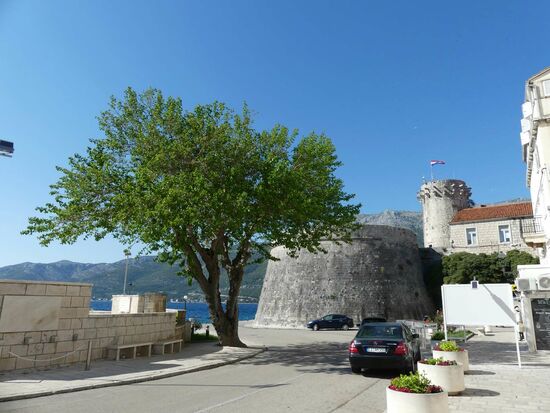 Fahre um 07:15 los und zuerst zum Bäcker, Frühstück kaufen. Dann fahre ich direkt in Makarska auf die D59 in Richtung Vrgorac. Es geht hoch in das Biotop Gebirge. Noch in Makarska biege ich auf die D512 in Richtung Vrgorac ab. Hier fahre ich sehr schön kurvig, meist noch im Schatten, bevor ich in die 6199 abbuege und die kurvige Strecke genieße bis ich auf einer längeren Geraden meinen Platz für die Frühstückspause finde. Während ich frühstücke, kommen doch 2 Autos vorbei, was für ein Verkehr heute morgen. Das erste Wasser ist wieder aufgebraucht und nach einigen Fotos geht es weiter. Es ist eine schöne Strecke mit einigen Serpentinen, bevor ich dann auf die D62 abbiege, der ich kurz folge, um dann mit der67199 wieder 5 stellige zu werden. Die ist aber sehr gut befahrbar, kein Vergleich zu den Holzfällerstraßen vorher. Jetzt komme 7ch wieder auf die D62, die aber im Bau ist. Die rechte Spur ist schon ohne Asphalt, aber für dieses Stück gibt es noch keine Baustellenampel, heißt bei Gegenverkehr auf den Schotter ausweichen -- kommt zum Glück keiner. Dann steht ein LKW auf der Fahrbahn und ich fahre lieber links ran, statt auf dem unbefestigten an dem vorbei zu fahren. Der Fahrer steigt auch schon ein und fährt weg. Dann kommt doch die Baustellenampel, da jetzt die rechte Spur ca. 2m tiefer gelegt wurde, um Kabel zu verbuddeln. Dann biege ich geplant ab auf die 67202 und entgehen der Vollsperrung der D62. Es geht jetzt durch Wein und Gemüsehändler auf einer schmalen, geraden Straße weiter und in einem gelungenen Bogen unter der Autobahn auf die 67203. Schön, aber eng, dafür wieder leer. Jetzt kommt ein Stück, das ich auf meinem Versuch über Polce nach Vrgorac zu kommen schon 2x gefahren bin. Am Kreisverkehr biege ich jetzt in Richtung BIS (Bosnien i Herzogovina) ab. Jetzt fahre ich auf der 6276 alleine durch die Kurven, bevor es auf der 69086 und die 69009 weiter zur D8 geht. Diese ist schön zu fahren u ich folge ihr kurvig, manchmal 2spurig, so dass ich langsamere überholen kann, bevor mein Problem mit der kurviger-app beginnt. Ich biege nach Anweisung links ab bis ich vor einer unbefestigten Straße stehe. Jetzt plane ich um, und da kommt mir kurviger in die Quere, da lt. Der Karte die D8 in BIH nicht durch geht, sondern ein Stück fehlt. Ich plane um, nehme wieder unbefestigte und kleinere Straßen raus ==> ich soll zurück bis Polce und da die Fähre nehmen. Da ich dazu keine Lust habe, nehme ich kleinere Straßen wieder auf. Jetzt gibt es eine Route über BIH. Also los,d.h. ein Stück zurück, parallel zum Fluß Nerv bis nach Metkovic und dann über kleine Straßen zur Grenze nach BIH. Hier lerne ich wieder etwas dazu: der Grenzer sagt mir, das ist eine nationale und keine internationale Grenze und ich muss ca. 1 km zurück und dann links zur internationalen Grenze. (Was ist eine nationale Grenze? ). Die internationale Grenze ist an der D8 und der auf der kann ich Bus zur erneuten Grenze fahren, um wieder in Kroatien um sein. (gut dass die Kurviger - Entwickler mich jetzt nicht gehört haben ). Ich hatte meinen Kopfhörer ausgeschaltet und da die Strecke schön war, habe ich die Abzweigung nach Korcula verpasst. Dann kam ein Schild : Dubrovnik 30 km und ich nehme den nächsten Parkplatz, um zu prüfen. Ich bin gerade abgestiegen, als hinter mir ein Auto hält und der Fahrer aussteigt ?? Er zeigt mir, dass meine Bänder der Taschen sich gelöst haben. Schönen Dank. Nachdem ich diese wieder befestigt habe, prüfe ich die Strecke, wieder eine Abzweigung verpasst. Also zurück bis Soli und dann links abbiegen, das klappt diesmal. Die Straße ist wieder sehr klein und als mir ein Auto entgegen kommt, wird es sehr eng, sozusagen auf dem letzten Asphalt komme ich durch. Ich fahre ca. 5 km, dann kommt ein komisches Schild, das ich ignoriere (ein Fehler). Weitere 3 km später stehe ich vor einer Großbaustelle: meine Straße gibt es nicht mehr, da steht ein Riesenkran und darüber entsteht eine neue Brücke. Wieder zurück, das Schild fotografieren und dann fahre ich den Rest nach Schildern bis nach Orebic zur Fähre. Am Ortseingang noch tanken und dann ab zur Fähre. Ich komme an und die Einschiffung hat begonnen. Ich sehe keinen Tickets_Schalter, dann aber einen Mitarbeiter, dem ich winke. Der kommt auch sofort, zeigt mir den Weg zum Schalter und ich dahin. Ticket gekauft, wieder in die Reihe und noch als letzter mit auf das Boot. Das Moped steht noch nicht, da sind wir schon unterwegs. Auf Korcula fahre ich noch die geplante Runde, die wirklich sehr schön zu fahren ist.