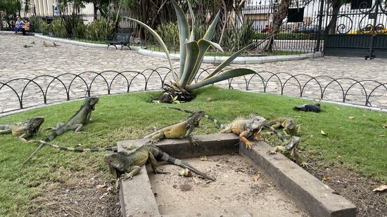 Überall sind die Leguana zu finden. Wir beobachten, wie sie auf Bäume und Büsche klettern und sich an den grünen Blättern satt essen.