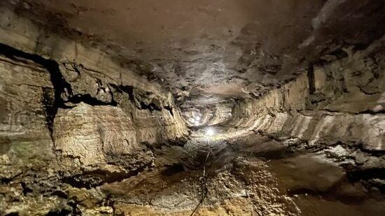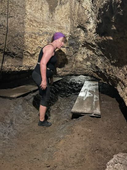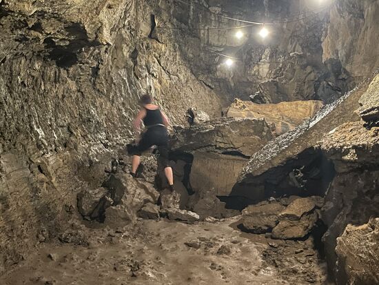An den Wänden sieht man verschiedene Schichten—eine Lavahöhle entsteht, wenn der Lavafluß an der Oberfläche zuerst erstarrt und die Lava im Inneren flüssig bleibt und weiterfließt—so entsteht nach dem Versiegen des Lavastroms ein Hohlraum.