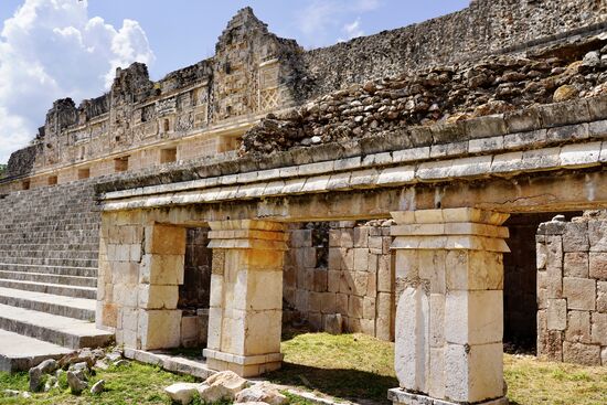 Blick von der Rückseite des „Nonnenviereck“ auf die Pyramide. Die Öffnungen in der Pyramide stellen ein Gesicht dar. Links und rechts der Treppe in der Mitte sind Masken zu erkennen. Dies sind Masken des Regengottes Chaac.