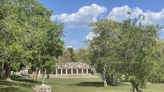 Der Ballspielplatz. Er ist wesentlich kleiner, als der in Chichen Itza. Im Hintergrund zu erkennen ist der Gouverneurspalast.