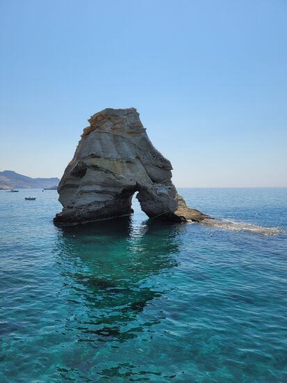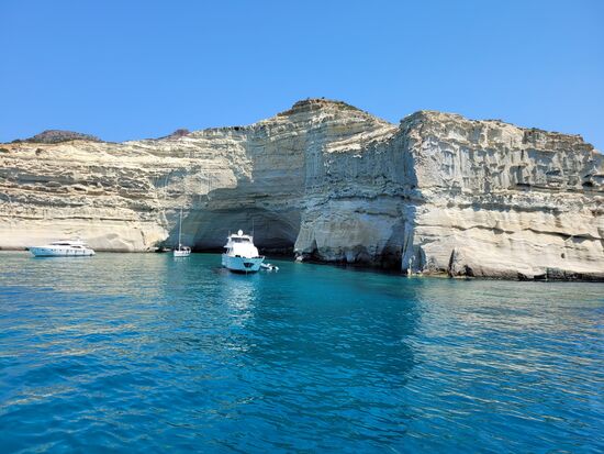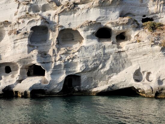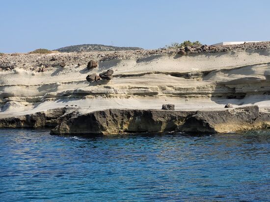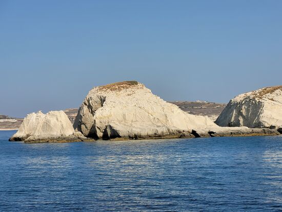 Mit dem Boot "Captain Yiangos" umrundeten wir von 9.00 h morgens bis fast 19.00 h die hufeisenförmige Insel und machten auch einen Abstecher nach Kimolos. Alle an Bord (fast ausschließlich Italiener) bestaunten diese fantastische Küste mit ihren bizarren Felsformationen und knipsten wild drauflos, so auch wir. Jetzt haben wir viele, zu viele Fotos!