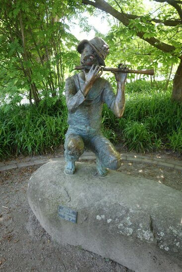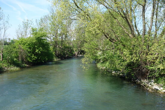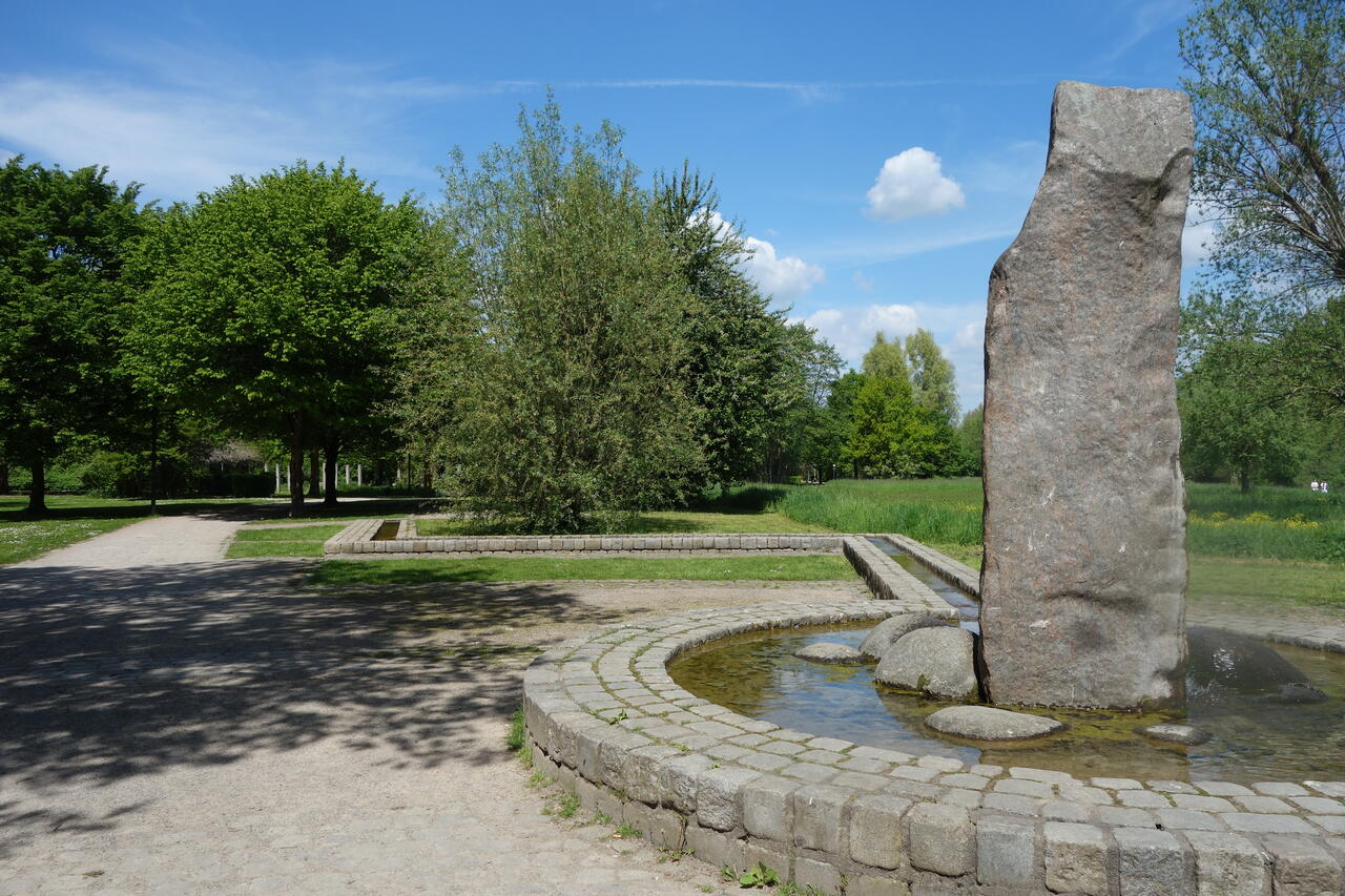 Ein künstlich angelegter Bach im Steinbett verläuft im Mäandermuster durch einen Teil des Parks.