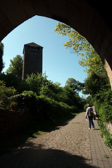 Der „Dicke Turm" wurde vermutlich am Ende des 14. Jahrhunderts von Graf Otto I. als Torturm errichtet. Der Zugang zum oberen Burghof führte ursprünglich durch den Turm hindurch, was eine besonders wirkungsvolle Verteidigung ermöglichte. Zu einer feindlichen Besetzung der Burg kam es jedoch nie.