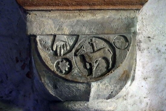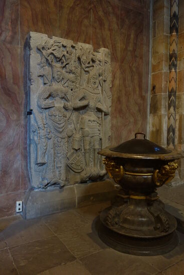 Das Taufbecken im Chor stammt von 1615. Der Fuß ist mit vier aufsteigenden Voluten verziert. Die vier geflügelten Engelsköpfe am oberen Beckenrand sollen die Taufe bezeugen.