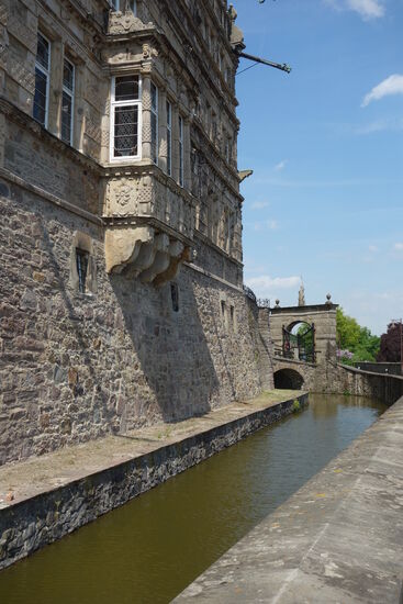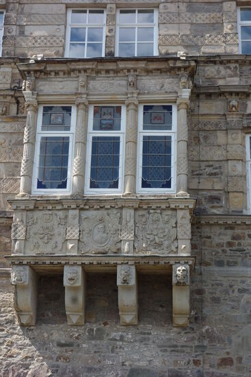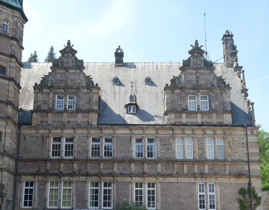 Der südliche Hauptflügel wurde 1597 begonnen und 1599 beendet. Seine dreigeschossige Schauseite ist 61 m lang und üppig dekoriert mit abwechselnd glatten und bossierten Quaderstreifen, wodurch die Längenwirkung noch verstärkt wird, während die Giebel der vier dichtgereihten Zwerchhäuser die Höhe betonen. Hierzu kontrastieren die weit hervorragenden, kupfernen Wasserspeier. Der Erker im Erdgeschoß der Straßenfront betont die Mitte, zu der die Achsen der gekuppelten Fenster symmetrisch angeordnet sind. Seine Steinpfosten sind mit ionischen Halbsäulen versehen, deren Schäfte von Kerbschnittquadern unterbrochen werden. Die Brüstung des Erkers ist mit Kartuschen und reichem Ornamentschmuck gefüllt, und seine Gesimse werden von Zahnschnittleisten belebt.