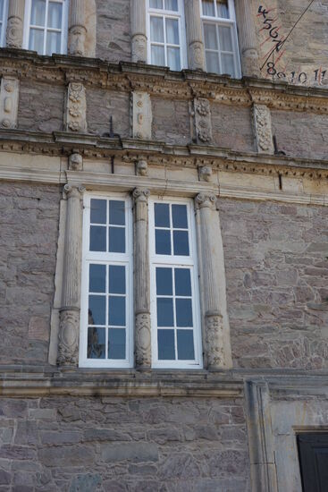 Bei den Treppenturmportalen tragen korinthische Rundsäulen den bekrönenden Aufbau, der in seinem friesartigen Unterteil die Wappen des Erbauerpaares und im Giebeldreieck das Brustbild Gottvaters zeigt. Die Türumrahmungen sind reich profiliert.