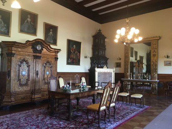 Oberhalb des Schlosses wurde im 19. Jahrhundert ein Landschaftspark mit exotischen Bäumen angelegt.