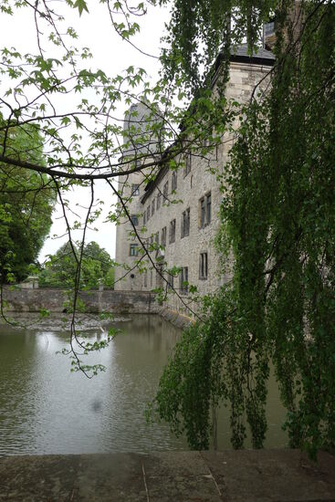 Es handelt sich um einen vierflügeligen, fast schmucklosen Schloßbau um quadratischen Hof mit zwei Treppentürmen in gegenüberliegenden Ecken. Drei Geschosse in Bruchsteinmauerwerk mit sehr breiten, rechteckigen Fensteröffnungen. Die gesimslosen Wände werden lediglich durch die regelmäßig gereihten, gekuppelten Fenster gegliedert. Von allen Schlössern der Weserrenaissance gibt gerade hier das Sollingplattendach (Sandstein aus derm Wesergebiet) als wesentlichstes architektonisches Element dem Gebäude das Gepräge.
