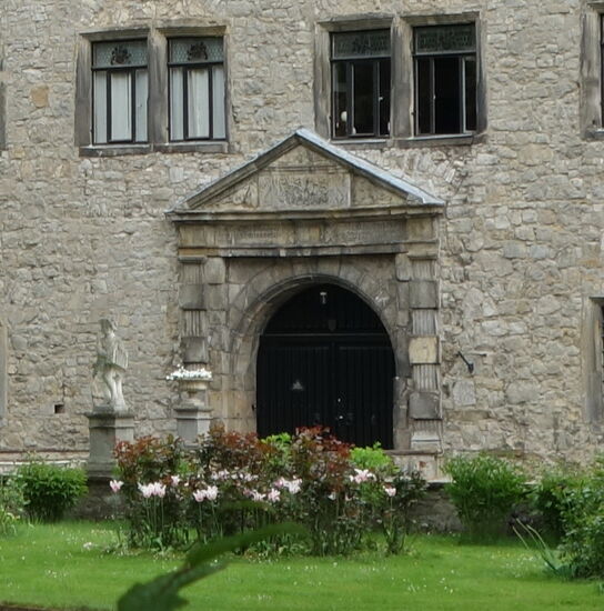 Das rundbogige Durchfahrtstor wird von einer Ädikula mit dorischen kannelierten Rustikapilastern gerahmt. Darüber im Dreiecksgiebelfeld die Wappen des Erbauerpaares.