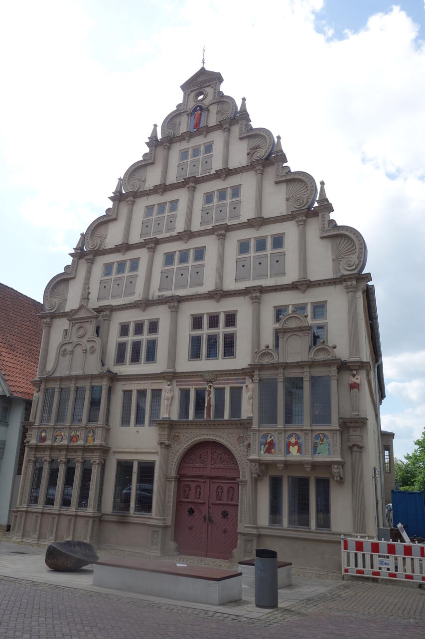 Schöpfer der Fassade muß der Lemgoer Baumeister Hermann Wulff gewesen sein. Die gleichen Steinmetzzeichen wie am Schloß Brake, das Wulff 1585—1592 erbaute, kehren an der Fassade wieder. Das übrige Gebäude errichtete wahrscheinlich der Lemgoer Steinhauer Ludolf Crossmann. Die plastische Durchgliederung mit lebhafter Schattenwirkung und die überaus wuchtigen Formen der Fassade stimmen u.a. mit denen der Lemgoer Rathausvorhalle überein. Zudem kehren hier für den Meister Hermann Wulff typische Einzelformen wieder: z. B. die aus Medaillons hervorlugenden Büsten eines Mannes und einer Frau an der linken Auslucht. Die ebenmäßige und doch abwechslungsreiche Fassade wird von einem Staffelgiebel beherrscht, dessen Stufen durch halbkreisförmige und mit einem senkrechten Stück an die Staffel geheftete Volutenbänder (nur unten in Spiralen endend) sowie durch Muschelfüllungen gemildert werden.