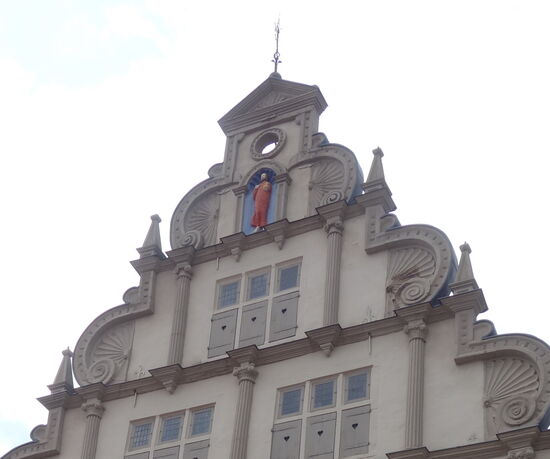Eine Ädikula mit Dreieckgiebel bildet die Giebelbekrönung. Darunter in einer Nische Christus mit der Weltkugel. Große dreiteilige Fenster und nicht übereinanderstehende (auf Luke) schwere Halbsäulen sowie fünf kräftige Gesimse, die sich jeweils um die Säulenbasen kröpfen und die Horizontale betonen, gliedern die Fassadenfläche.