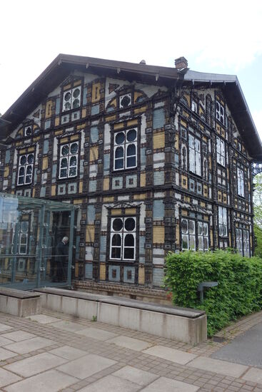 Das Junkerhaus ist eine Schöpfung des Künstlers Karl Junker (1850-1912). Es handelt sich um einen zweigeschossigen Fachwerkbau mit Backsteinsockel und quadratischem Grundriss. Sein ungewöhnliches Aussehen erhält das Haus durch die reich geschnitzte Bauornamentik.