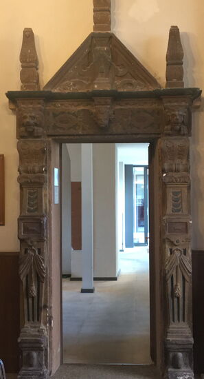 Das rundbogig geschlossene Portal, das nicht in der Mittelachse des Hauses steht, wird von starken ionischen Säulen eingefaßt, darüber vollplastisch Adam und Eva mit dem Baum der Erkenntnis