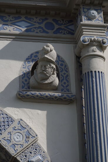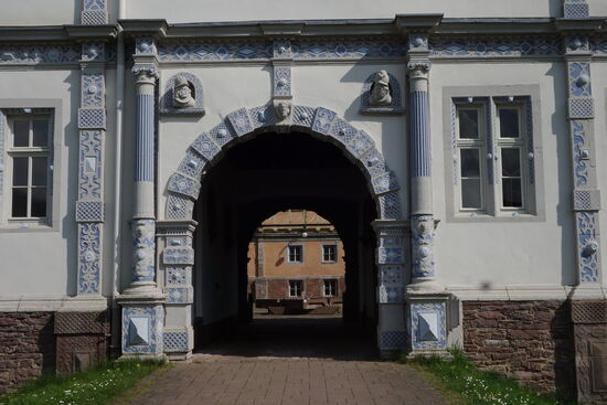 Das wuchtige, rundbogige Portal der Durchfahrt wird von Säulen und hervorlugenden Wächterköpfen flankiert und wird ebenso wie das entsprechende Portal auf der Hofseite abwechselnd von Kerbschnittbossensteinen und Beschlagwerkquadern eingerahmt.