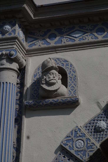 Im Gegensatz zu den übrigen Außenseiten ist an der Eingangsfront die Lisenengliederung der Giebel und Zwerchhäuser über die ganze Fassade weitergeführt.