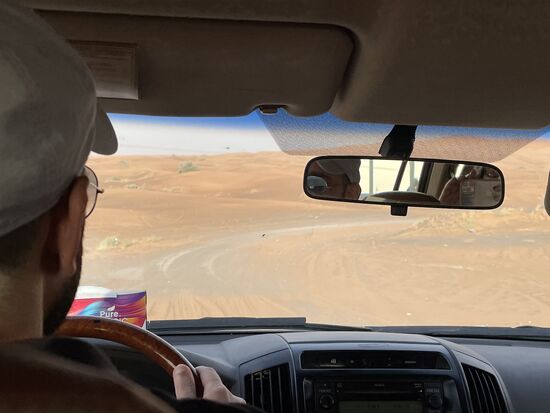 Nachdem meine beiden Reisebegleiter von ihrer Quadtour zurückkommen, geht es weiter. Wir haben die Strasse verlassen, fahren in die Wüste. Inzwischen sind wir ien kleiner Konvoi von drei Fahrzeugen. Und jetzt verstehe ich auch, warum diese Überrollbügel haben. Wir fahren eine Düne hinauf, sind einen kleinen Moment oben auf der Krete, bevor es auf der anderen Seite steil wieder hinuntergeht. Dabei kommt der Wagen gefährlich in Schräglage. Das kann man vor allem am Wagen vor uns gut sehen und auf hier im Auto schüttelt es schon ganz bedenklich.