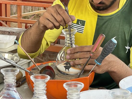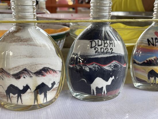 Ich werde es mir durch den Kopf gehen lassen, im Moment bin ich gespannt, was mich in der Wüste erwartet. Schon bald verlassen wir die Strasse und halten bei einem kleinen Dorf an. Das heisst eigentlich sind es ein paar Unterstände, ein paar kleine Shops, viel Lärm und ein paar Leute. Der Lärm kommt von den Quads, mit denen man hier ein paar Runden durch den Wüstensand machen könnte. Fast alle, die hier nach und nach eintreffen, drängen sich am Schalter, warten darauf, dass sie losdüsen können. Ich sehe mich lieber an den Ständen um. Vor allem fasziniert mich der Mann, der Sandbilder macht. Mit farbigem Sand gestaltet er Hintergründe und mit einem dünnen Blashalm zeichnet er Kamele darin, oder schreibt den Namen. Und das gleich auf Bestellung. Ich sehe ihm eine Zeitlang zu, kaufen werde ich keine seiner gut verschlossenen Flaschen. Ich bin noch viel zu lange unterwegs, als dass ich mir bereits hier Souvenirs kaufen möchte.