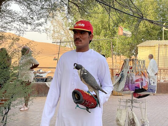 Wer nicht mit dem Quad unterwegs ist, könnte sich auf eines der Kamele setzen, die unter einem Zeltdach stehen, doch ich erspare ihm die Mühe. Und auch den Wüstenfalken möchte ich nicht auf meinen Arm nehmen. Die Jagd mit Falken scheint eine hohe Bedeutung zu haben. Es sind verschiedene Anbieter für alle möglichen Unterhaltungen hier und eigentlich wenige Touristen. Bestimmt ist dieser Ort in normalen Zeiten überfüllt. Jetzt kämpft jeder darum, dass der Fremde ein paar Dinars fallen lässt.