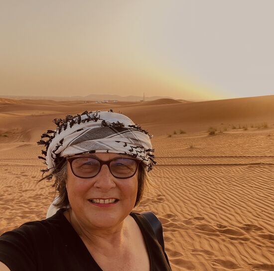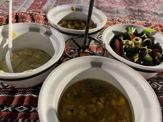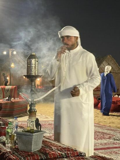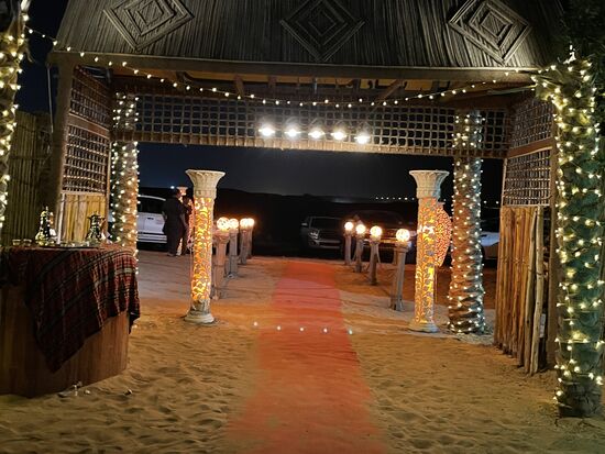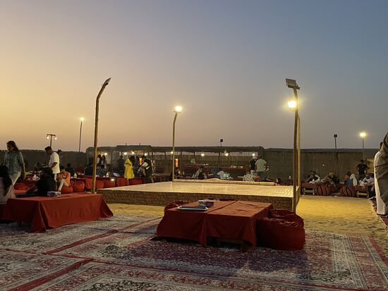 Es ist ein Camp in der Wüste. Rundum stehen Zelte oder niedrige Gebäude, in der Mitte eine Bühne und rundum liegen Teppiche mit niedrigen Tischen und Kissen. Wir sind am Ziel.