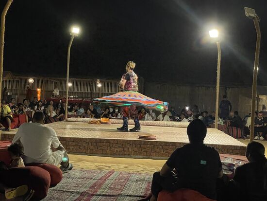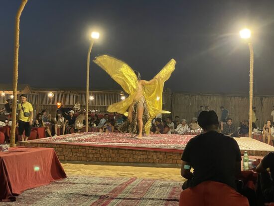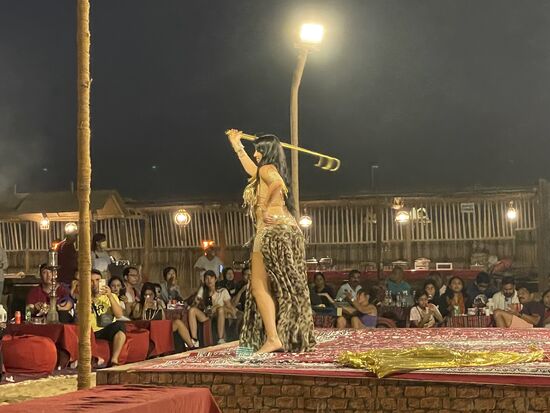 Auf der Bühne unterhält eine Bauchtänzerin die Leute und wirbelt mit ihrem langen Kleid, über die Bühne.