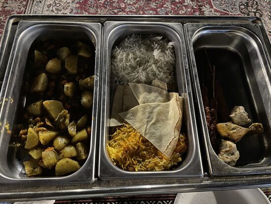 Es gibt verschiedenen gekochte Vorspeisen, scharfe Sossen und danach eine grosse dreiteilige Pfanne mit Gemüse, Kartoffeln und Fleisch.. Viel zu viel für mich allein, aber sehr fein gekocht.