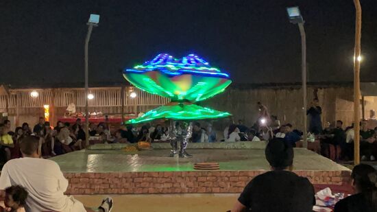 Danach kommt ein Mann mit einem breiten Rock, der sich am Schluss als LIchtkleid herausstellt. Auch er wirbelt über die Bühne und seine Lichter haben einen wunderschönen Effekt in der dunklein Nacht . Nur noch ein paar LIchter brennen, es ist inzwischen richtig dunkel geworden.